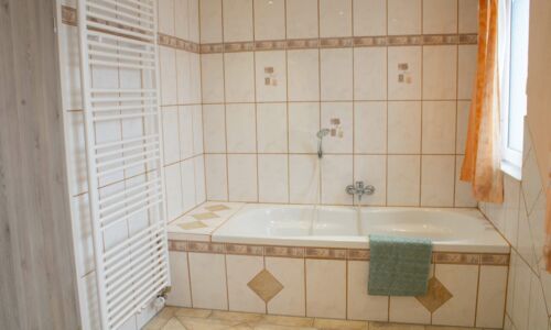 Bad 2 mit Badewanne, WC und Hand- und Badetüchern im Erdgeschoss