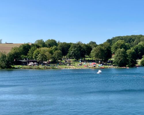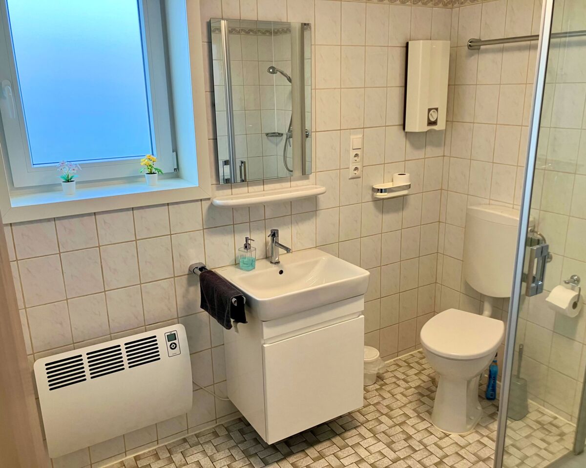 Bad 1 mit Dusche, WC und Hand- und Badetüchern auf der 1.Etage