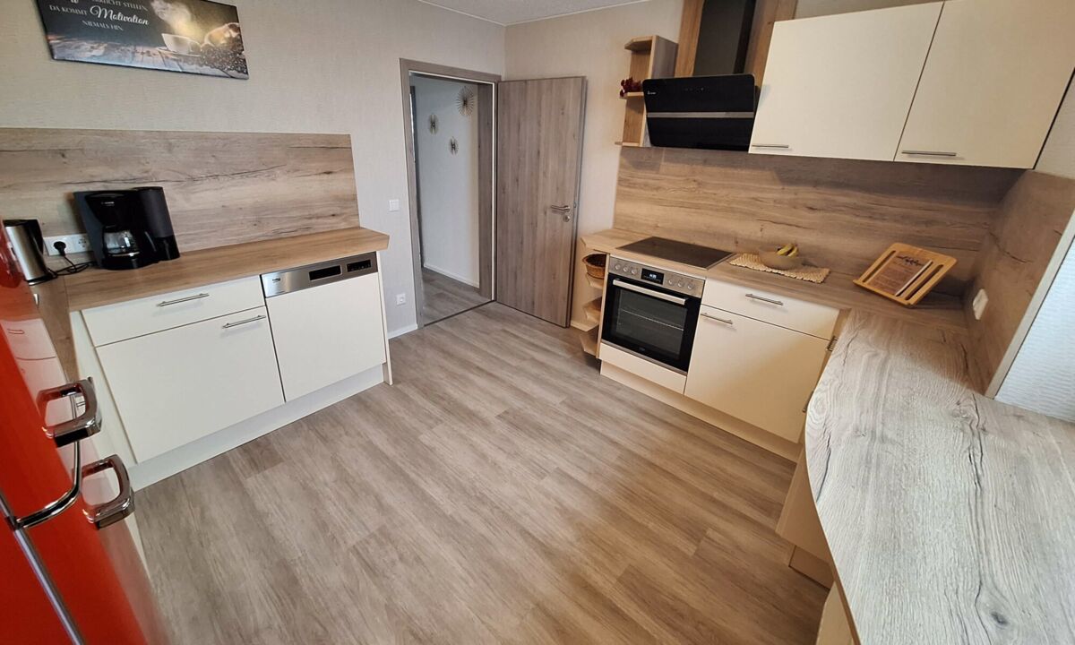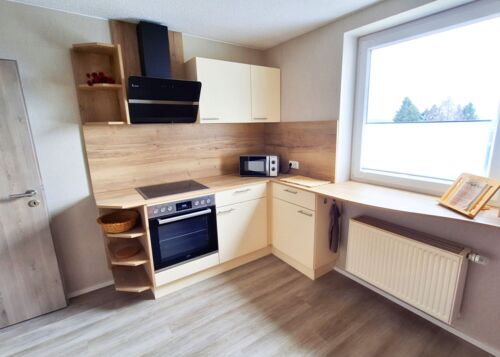 Küche: Kühl- Gefrierkombination, Ceranfeld, Backofen, Spülmaschine, Mikrowelle, Wasserkocher, Kaffeemaschine, Waffeleisen, Küchengeschirr und Küchentücher