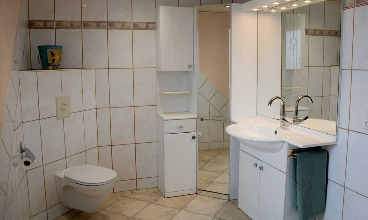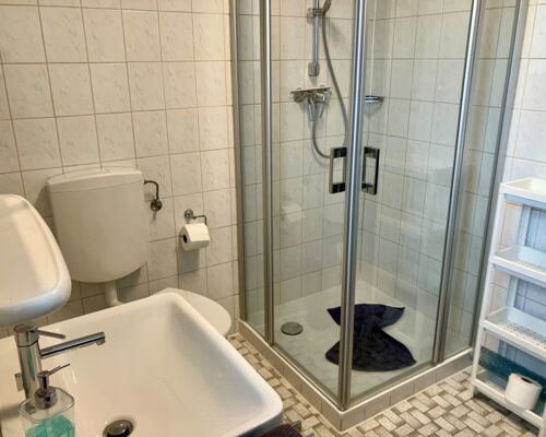 Bad 1 mit Dusche, WC und Hand- und Badetüchern auf der 1.Etage