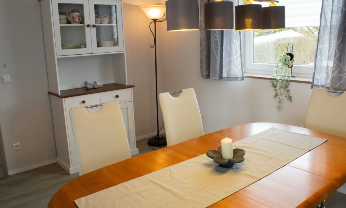 Esszimmer mit Tisch und 6 Stühlen (erweiterbar um einen Kinderstuhl)